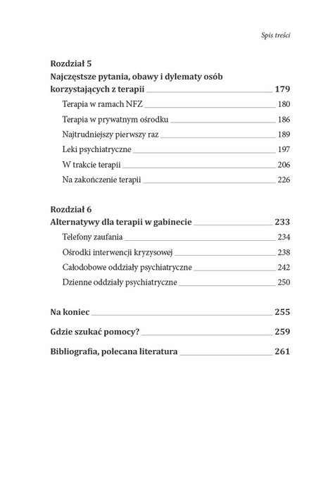 W jaki sposób gadanie na terapii może mi pomóc? Jak wybrać właściwego terapeutę i właściwą terapię? Co dzieje się za drzwiami gabinetu na różnych etapach terapii? Czy od leków psychiatrycznych zmienia się charakter? Co zrobić, gdy pilnie potrzebuję pomocy, terminy terapii na NFZ odbierają wszelką nadzieję, a mnie nie stać na prywatną wizytę? Jak wygląda pobyt na oddziale psychiatrycznym – i czy należy się go bać?