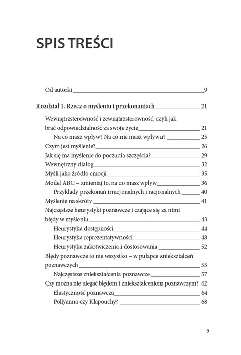 Nie wiemy, co jutro lub za kilka lat przyniesie nam los. Nie mamy wpływu na pogodę za oknem ani na to, co może nam się niespodziewanie przydarzyć. Możemy za to wpływać na nasze myśli o tym, co nas spotkało. Z tej książki dowiesz się, jak kształtować swoje myślenie, by było zdrowe i konstruktywne. Przeczytasz w niej o powiązaniu emocji z myśleniem oraz poczuciem szczęścia. Autorka poprowadzi cię drogą od poznania i rozumienia myśli oraz przekonań, przez naukę przeżywania emocji i reagowania na nie, do zmiany postrzegania samego siebie.