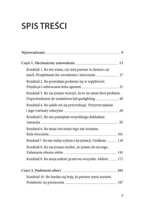Ta książka przyniesie ulgę wszystkim ofiarom narcystycznych manipulatorów, które nie są ani słabsze, ani bardziej neurotyczne od innych – po prostu wpadły w sidła. Wyjście ze zniewolenia, jakim jest toksyczna relacja, to długi i trudny proces, ale jest to walka, którą warto stoczyć.