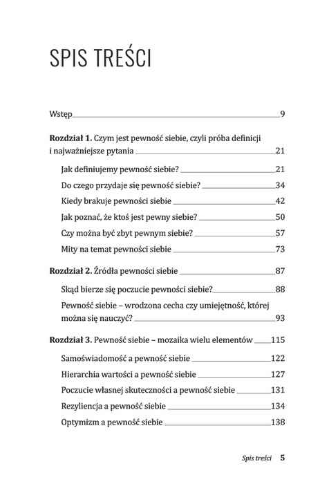 Dzięki temu poradnikowi odnajdziesz wewnętrzną siłę i nauczysz się budować stabilną, opartą na solidnych postawach pewność siebie. Autorka wyjaśnia, czym tak naprawdę jest pewność siebie, jakie są jej źródła i jak się jej nauczyć. Opowiada o roli doświadczeń z dzieciństwa i naszej historii życiowej, znaczeniu samoświadomości, rezyliencji i optymizmu, poczuciu własnej wartości, a także strachu i błędach. Wyjaśnia też relację między asertywnością a pewnością siebie.