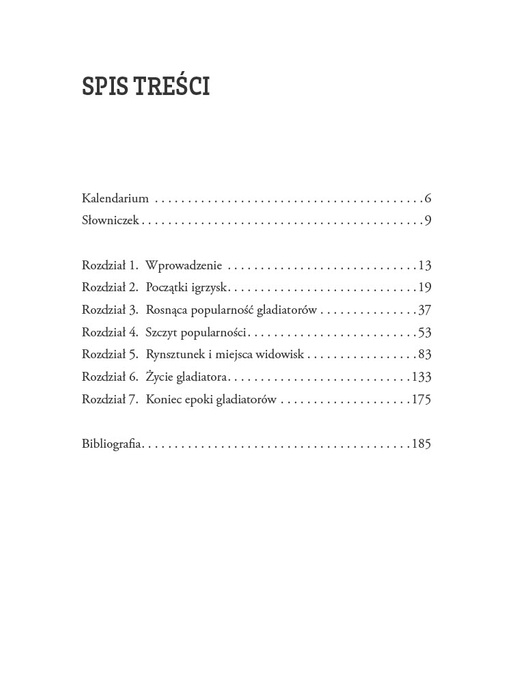 Ci aktorzy krwawych igrzysk byli gwiazdorami swoich czasów. Jak walczyli? Jak zmieniały się ich uzbrojenie i techniki walki? Kim byli? Ta książka w interesujący sposób przybliża historię gladiatorów i obala mity na ich temat. Przedstawia różne rodzaje walki i dobieranie pojedynkujących się wojowników tak, aby ich atuty i słabości odpowiednio się równoważyły. Opisuje współczesny stan wiedzy o gladiatorach i wyjaśnia, skąd czerpiemy o nich informacje – z zabytków starożytności, źródeł historycznych, ówczesnych malowideł ściennych i przede wszystkim ze znalezisk archeologicznych odkrytych w barakach gladiatorów w Pompejach.