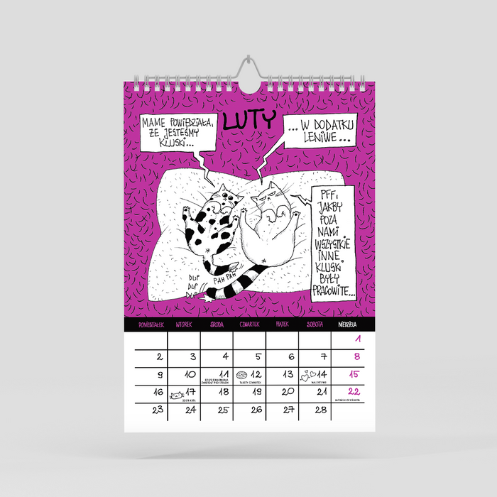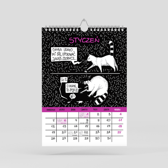 Kalendarz w układzie miesięcznym, ozdobiony zabawnymi komiksami o kocie Jaśniepanie autorstwa Magdaleny Gałęzi, znanej z profilu Miłozwierz na Facebooku. W kalendarzu oznaczono najważniejsze święta – także te nietypowe oraz dedykowane zwierzętom. Kotokalendarz ścienny Kota Jaśniepana wniesie w twój rok mnóstwo pozytywnej energii i humoru!