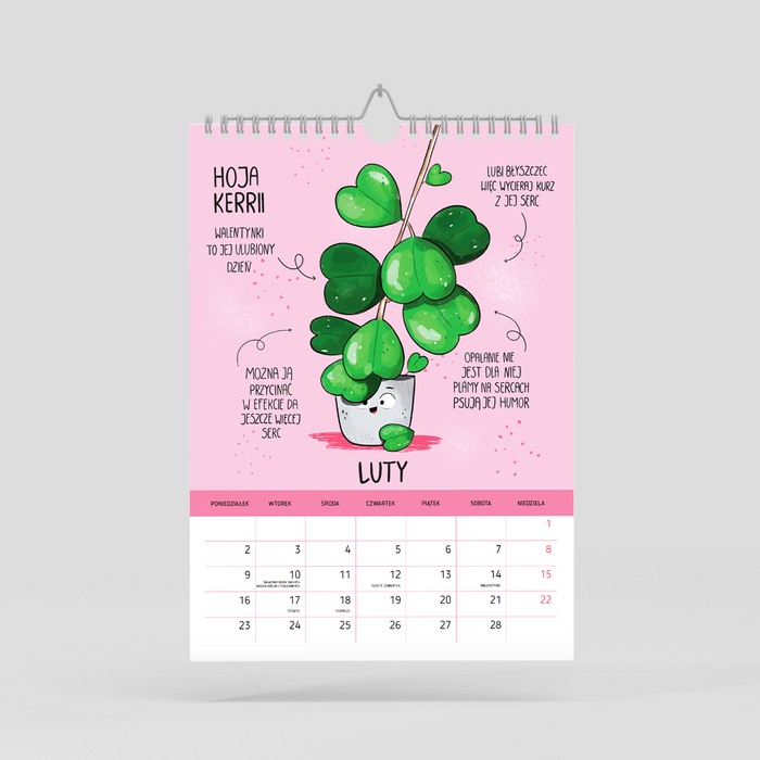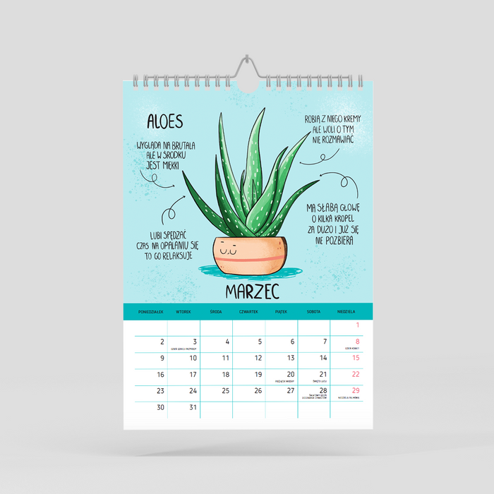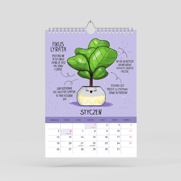 Kalendarz w układzie miesięcznym, ozdobiony wesołymi ilustracjami roślin, z najważniejszymi informacjami na temat ich wymagań i pielęgnacji. Fikus lyrata, aloes, monstera czy sansewieria to tylko niektóre z roślin doniczkowych, które będą ci towarzyszyły w kolejnych miesiącach. W kalendarzu oznaczono święta – także te nietypowe i związane ze światem przyrody. Kalendarz ścienny Długopisem malowane zabierze cię w 2026 roku do fascynującego świata roślin!